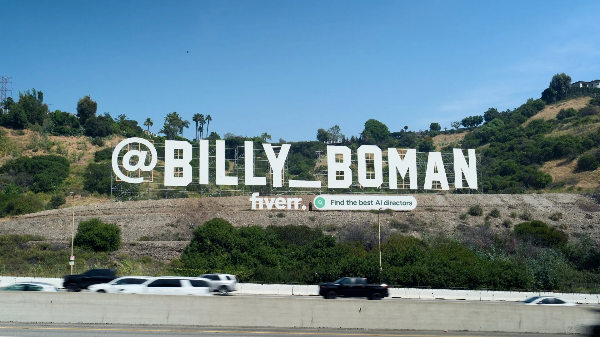 To launch Fiverr’s AI Directors category, we put one of our directors’ handles on a giant hillside sign in LA, just a few miles from that other one.